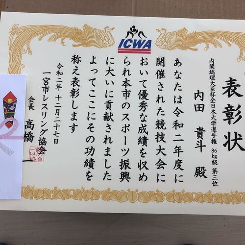 令和2年度 優秀選手表彰式 11月7日~8日に大阪・東和薬品RACTABドームにて開催された 内閣総理大臣杯全日本大学選手権において、当協会所属の内田貴斗選手(一宮レスリングクラブOB)が、86kg級第3位に入賞しました。 感染症対策を講じて表彰式を行い、会長…
